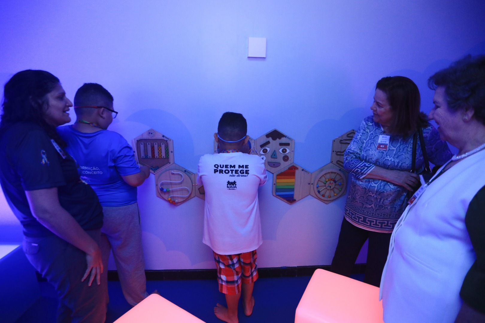 A Sala Multissensorial foi pensada como um espaço de descompressão. O ambiente reúne iluminação suave, projeções controladas, texturas terapêuticas e mobiliário adaptado, elementos que ajudam a reduzir o impacto de estímulos comuns aos terminais aeroportuários e proporcionam mais tranquilidade ao passageiro e a seus acompanhantes.