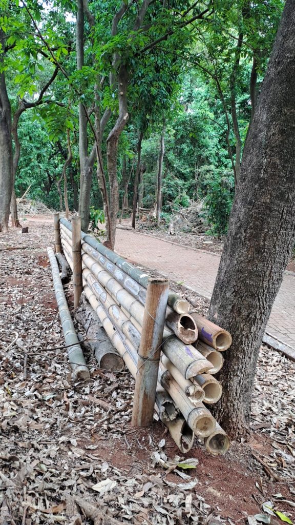 As paliçadas são estruturas feitas com colmos de bambu retirados do próprio parque. Elas reduzem a velocidade da água que desce das áreas mais altas, protegendo o solo e diminuindo o impacto sobre a nascente. A técnica, além de natural, não gera custo financeiro, já que utiliza exclusivamente material proveniente do manejo dos bambuzais locais.
