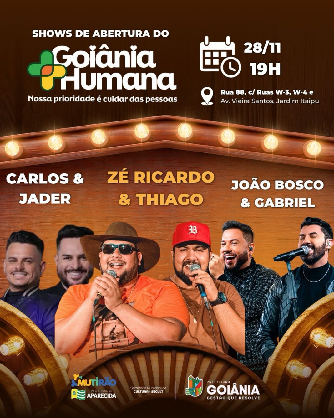 A Prefeitura de Goiânia, por meio da Secretaria Municipal de Cultura (Secult), abre nesta sexta-feira (28) a programação do Goiânia + Humana no Jardim Itaipu com uma noite de shows gratuitos. Três duplas sertanejas sobem ao palco: Zé Ricardo & Thiago, Carlos & Jader e João Bosco & Gabriel.