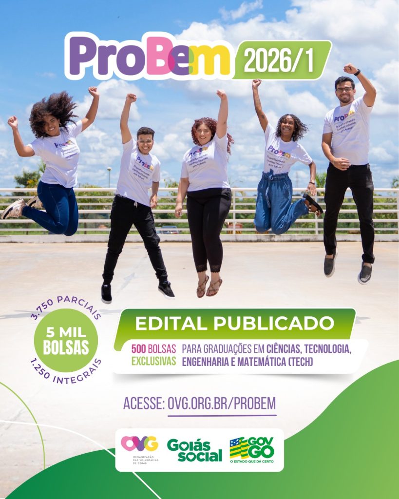 O Governo de Goiás, por meio do Goiás Social e da Organização das Voluntárias de Goiás (OVG), publicou o edital do Processo Seletivo 2026/1 do Programa Universitário do Bem (ProBem). Ao todo, serão ofertadas 5 mil bolsas de estudo, sendo 1.250 integrais e 3.750 parciais, destinadas a estudantes em situação de vulnerabilidade social em todas as regiões do estado.
