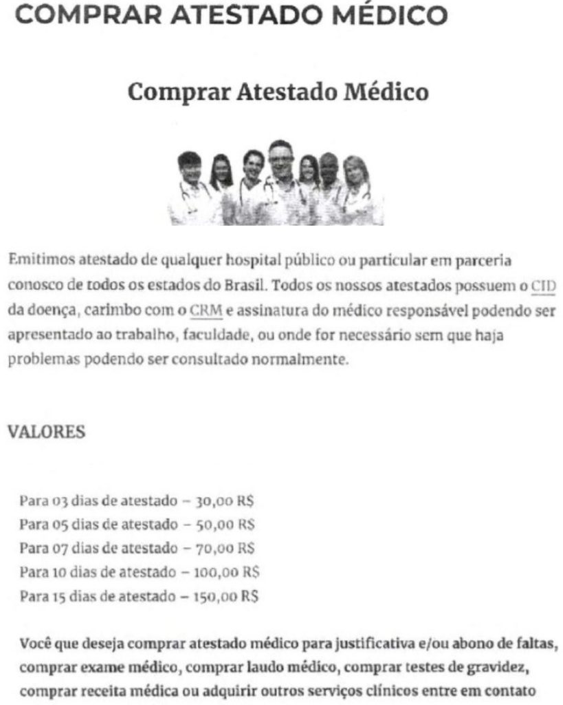 Os materiais eram ofertados com tabela de preços, variando conforme a demanda. Para dar aparência de legitimidade, os documentos incluíam nomes de médicos reais, códigos CID, carimbos e assinaturas falsificadas.