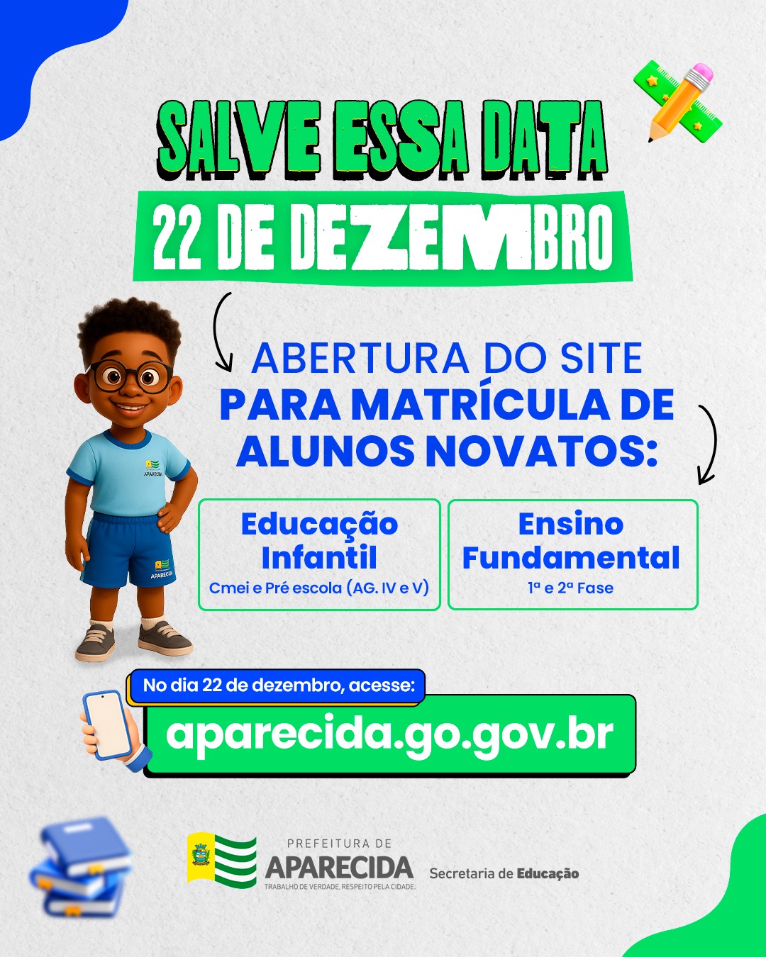A Prefeitura de Aparecida, por meio da Secretaria de Educação, inicia nesta segunda-feira (22) o período de matrículas para novos alunos da creche (6 meses a 3 anos e 11 meses), Pré-Escola (4 e 5 anos) e Ensino Fundamental (1º ao 7º ano). As inscrições devem ser feitas pelo site aparecida.go.gov.br.