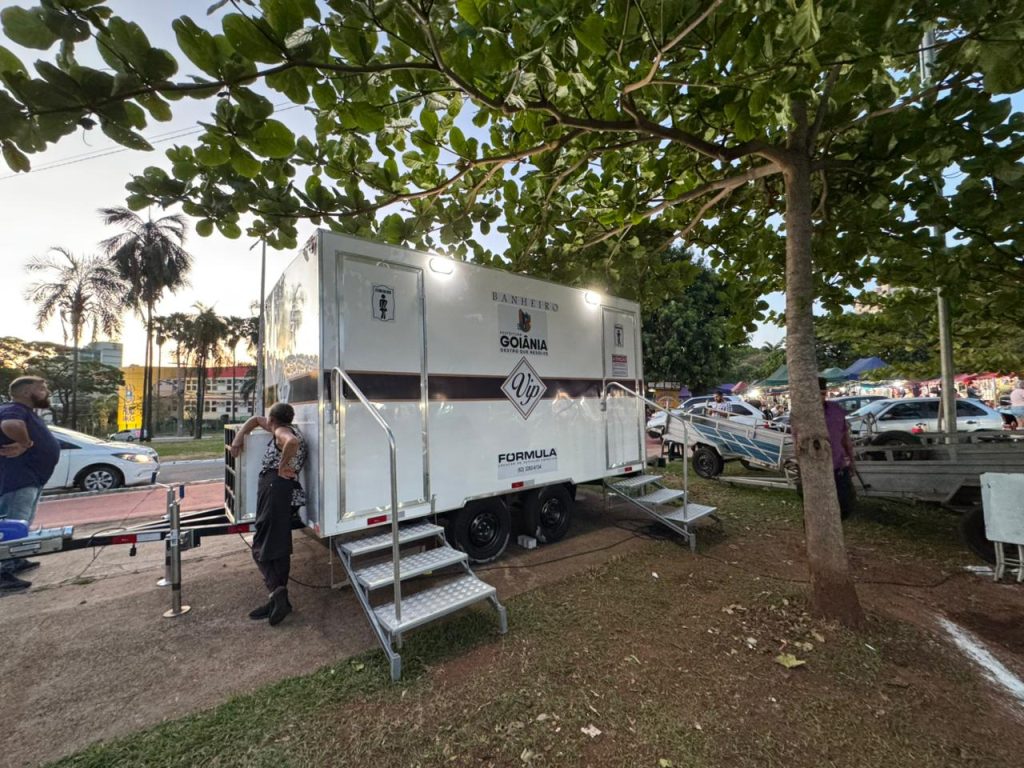 Os trailers contam com quatro cabines, pias individuais, sabonete, papel higiênico e limpeza ao longo do dia, garantindo conforto e higiene para feirantes e visitantes.