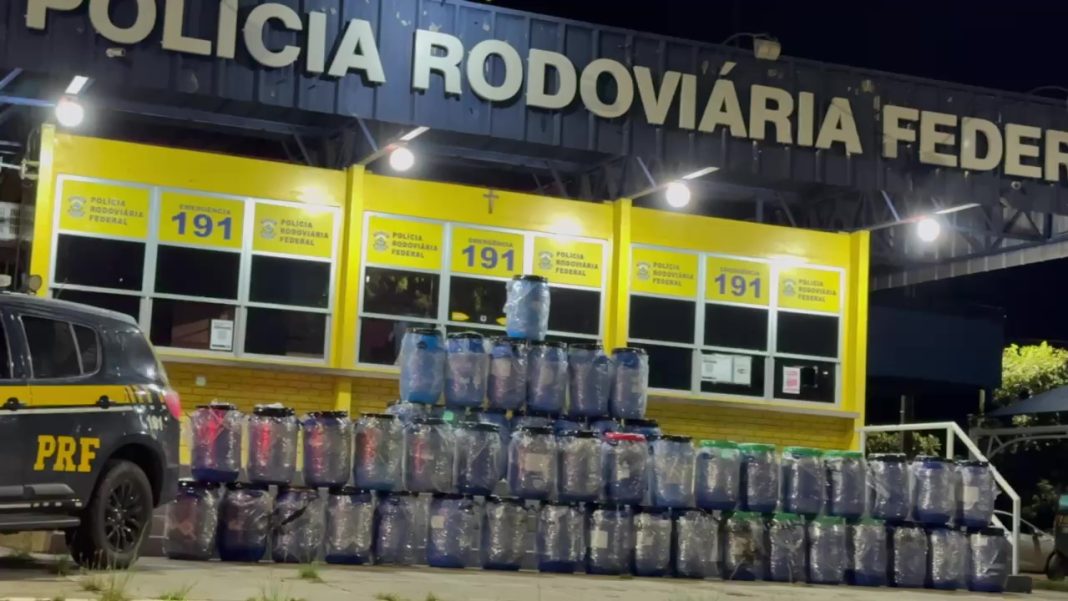 Diante da inconsistência nas informações, os policiais realizaram uma vistoria detalhada no compartimento de carga. Ao fundo dos materiais declarados, foram encontrados 49 tonéis lacrados contendo cerca de 1,5 tonelada de skunk.