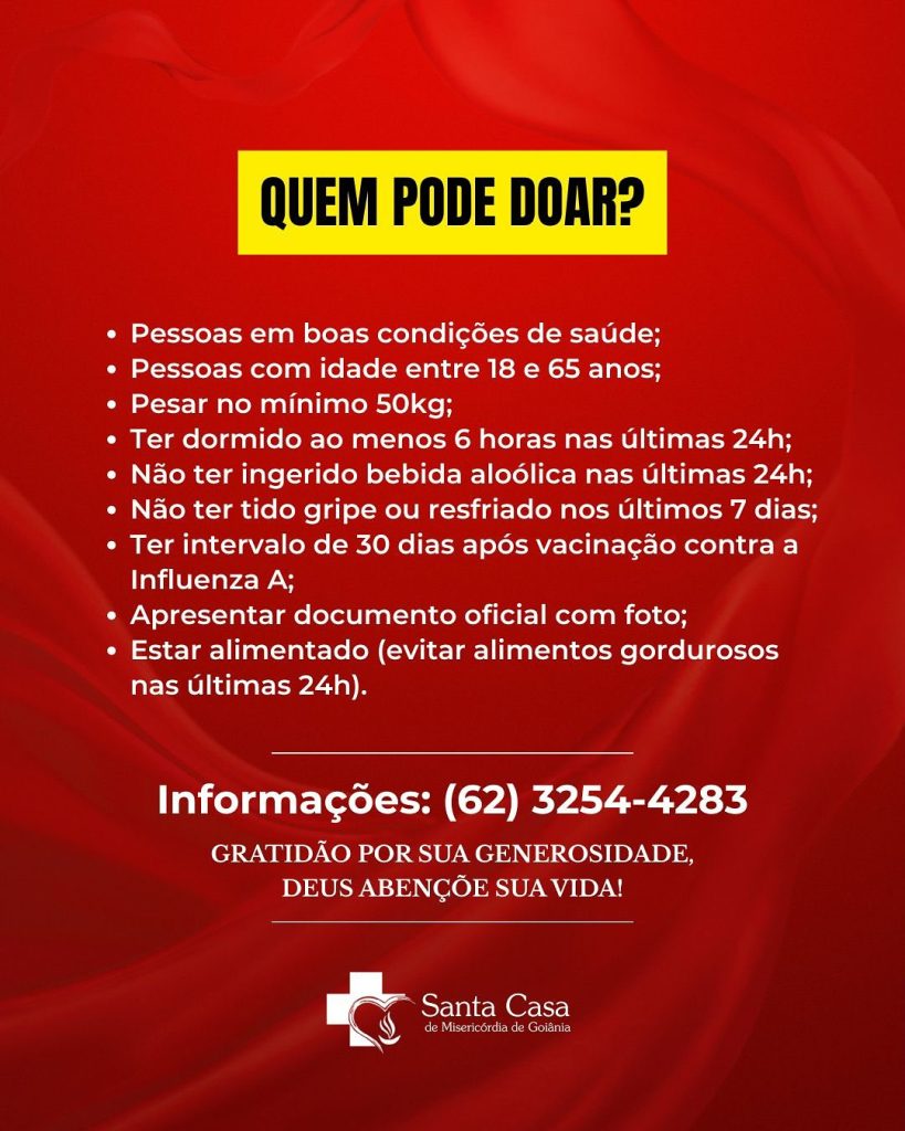 A Santa Casa de Misericórdia de Goiânia faz um apelo urgente à população: os estoques de sangue dos tipos negativos (O-, A-, B- e AB-) estão baixos. A doação é essencial para manter o atendimento de cirurgias, procedimentos médicos e tratamentos contínuos.