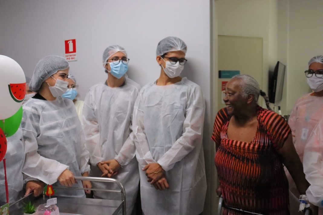 A paciente Terezinha Araújo dos Santos Costa, de 80 anos, vivenciou essa experiência após cinco meses de internação para tratar uma infecção no pós-operatório de fêmur. Ao deixar a unidade, destacou o acolhimento recebido durante todo o período.